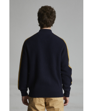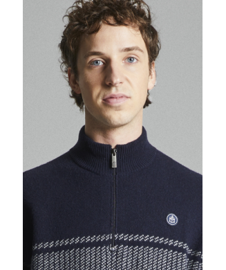Son jacquard placé apporte un motif graphique d’inspiration marine, rehaussé d’un badge brodé signature sur la manche.