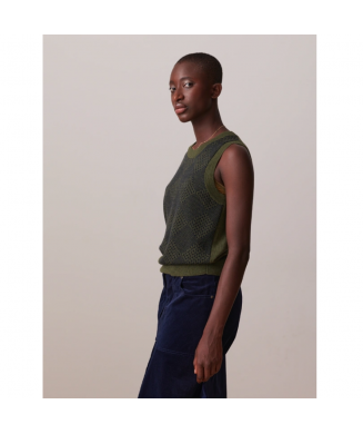 135,00 €Le pull Olia revisite le débardeur avec une touche graphique. Confectionné en maille jacquard bicolore à l’avant et uni au dos, il séduit par son col rond et ses emmanchures basses, idéales pour le porter seul ou superposé. Sa taille resserrée par un bord-côte apporte une touche structurée à la silhouette.